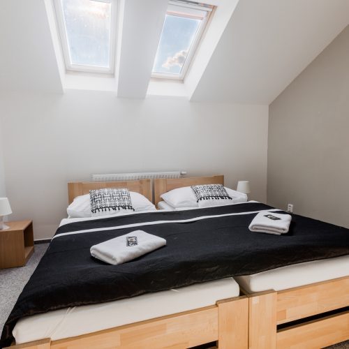 Patrový apartmán má ve společných prostorách gauč s možností využití na přistýlku za příplatek, ložnice v prvním patře má dvě samostatné postele, druhá ložnice má 1 dvoulůžkovou postel a jednu samostatnou.